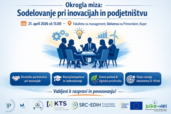 On Tuesday, 21 April 2026, at 1:00 PM, a roundtable titled “Collaboration in Innovation and Entrepreneurship” will take place at the premises of the Faculty of Management, University of Primorska in Koper (Izolska vrata 2, Koper).